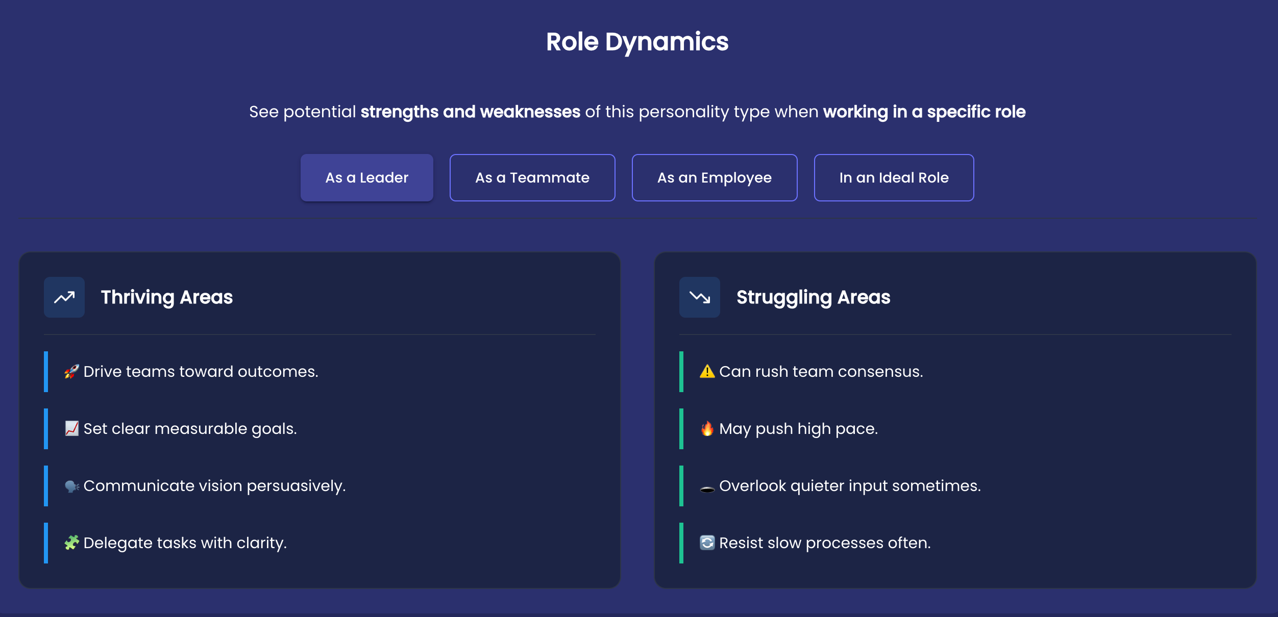 - Identify and bridge skill or style gaps – Our Assessments can reveal the collective strengths and potential blind spots of a leadership team, showing whether the group has complementary skills or overlapping weaknesses. This allows organizations to strategically build balanced teams, assign roles that play to individual strengths, and address gaps through targeted development or new hires.